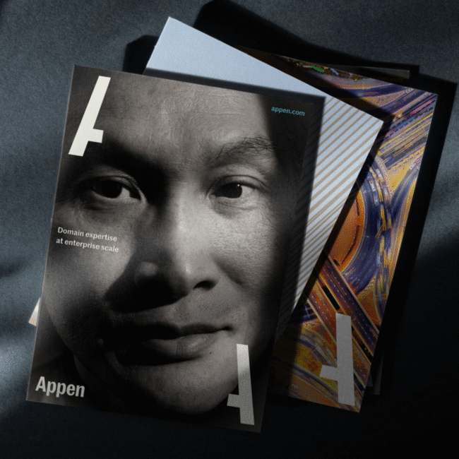 Appen was a sprawling project that gave us a chance to cover all aspects of the business. Kicking things off with a solid research period with a dozen internal stakeholder interviews, competitive analysis, and customer survey/interview work, we did some deep tissue massage on the brand strategy. A few weeks later we were off and running with a strong new logo and wordmark, colors, and design system, not to mention a revamped voice and house style and countless options for marketing material support.